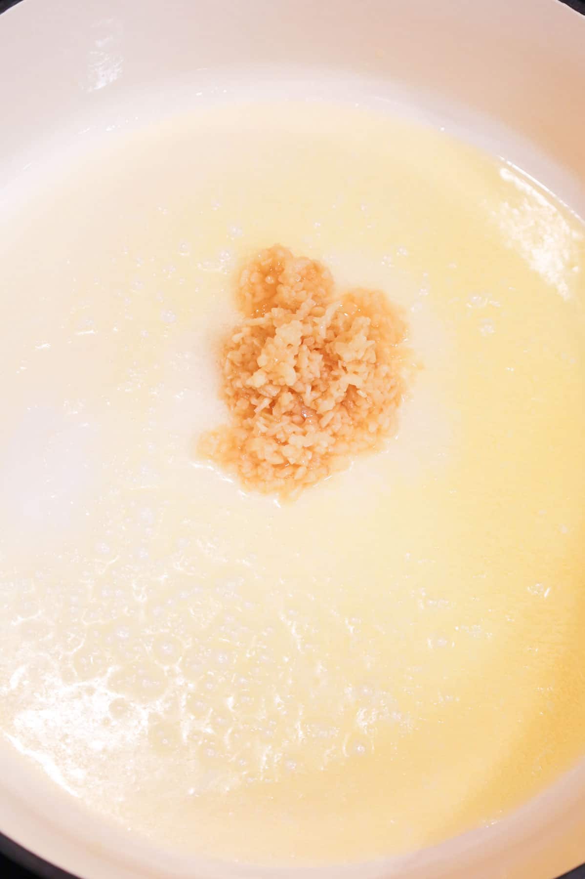 - Stir the butter and garlic together and continue cooking for 2-3 minutes until the garlic is fragrant.