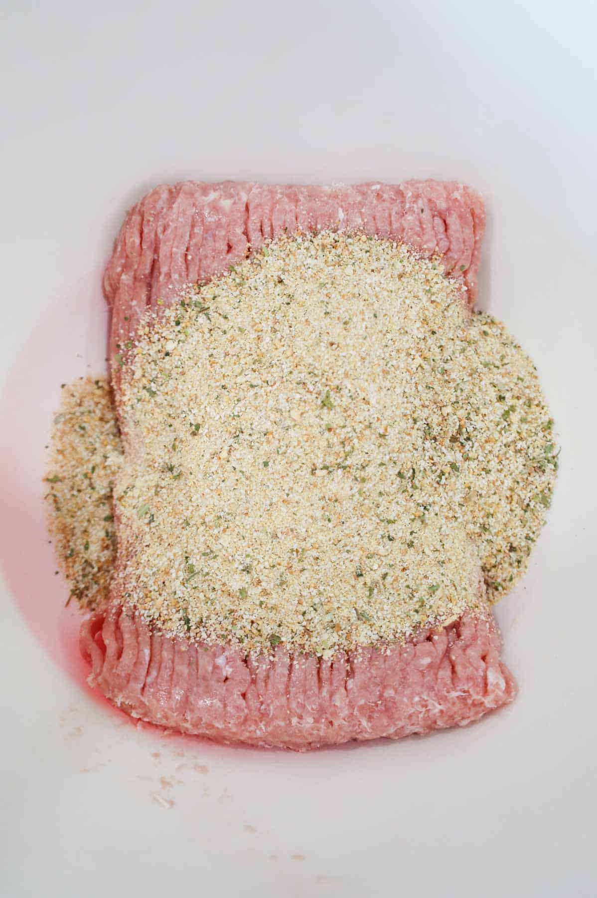 - Dump the ground chicken, bread crumbs, milk, egg, salt, pepper, garlic powder and grated parmesan cheese into a large mixing bowl.