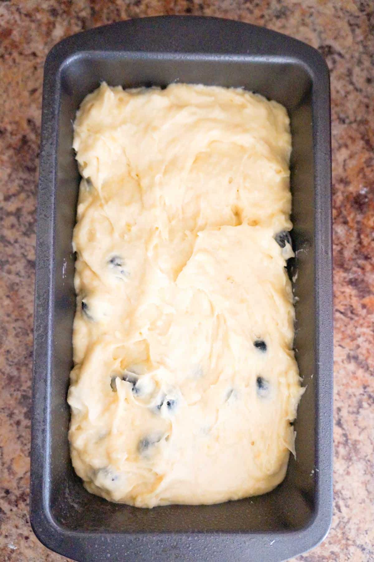Then I poured the batter into a greased 9 x 5 inch loaf pan and spread it out evenly.