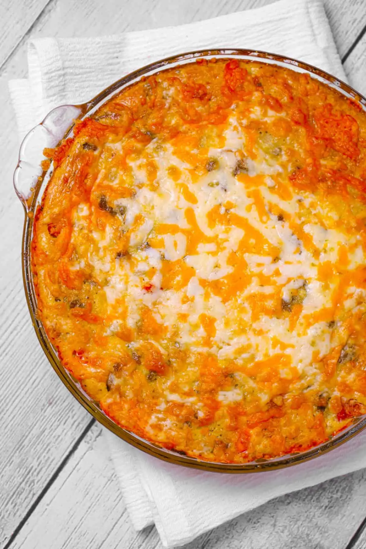 - After 20 minutes remove the pie from the oven and sprinkle the remaining ½ cup of shredded cheese on top.