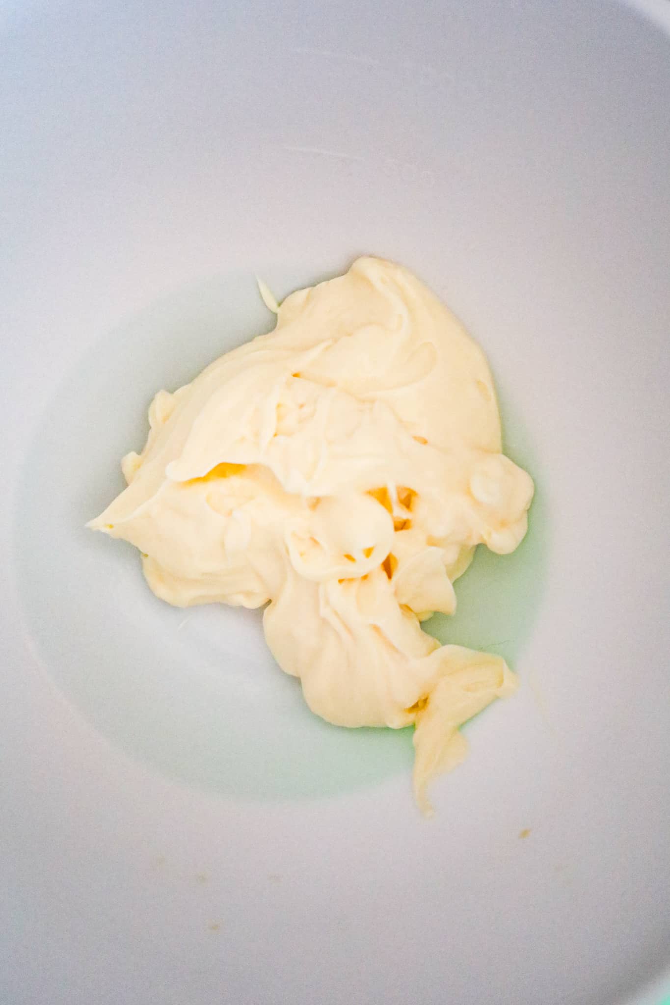 To make these cheeseburger subs, I started by dumping some mayo into a small mixing bowl.
