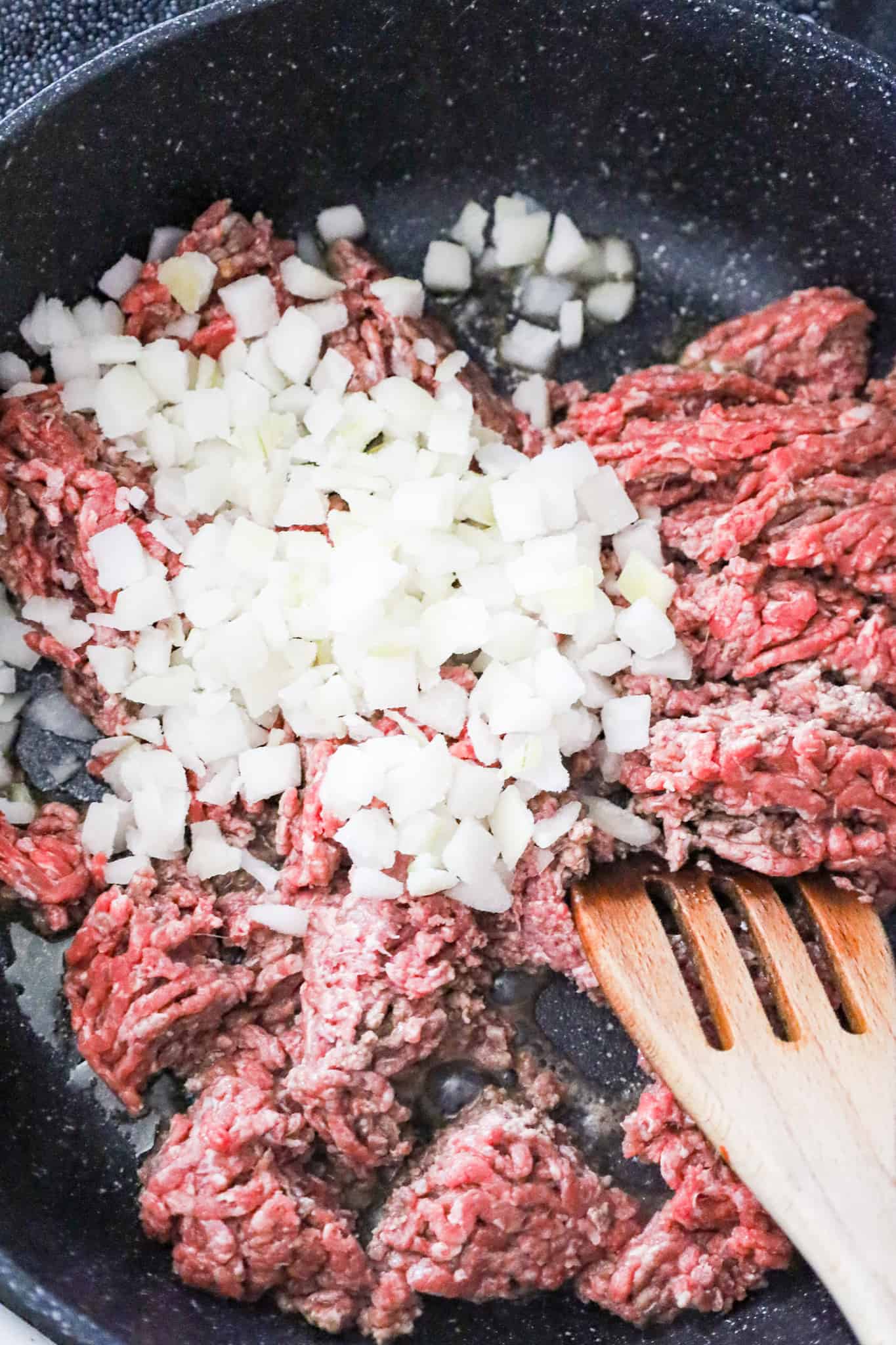 - Add the salt, pepper, garlic powder and onion powder to the skillet with the ground beef.