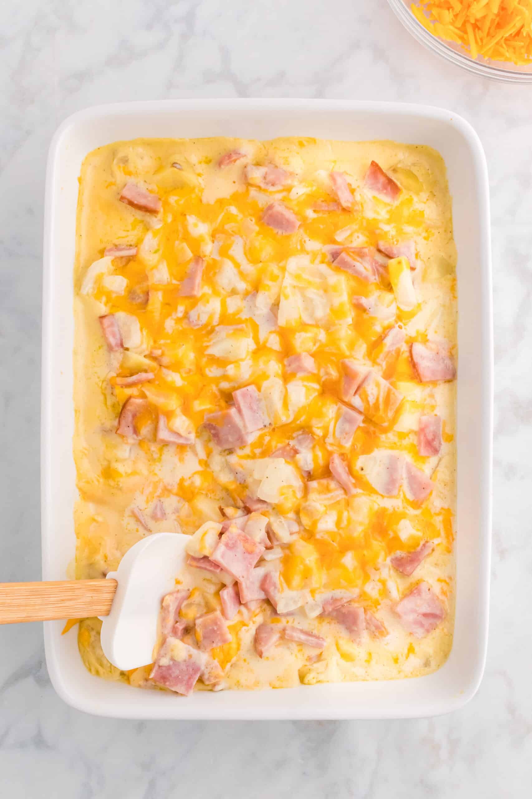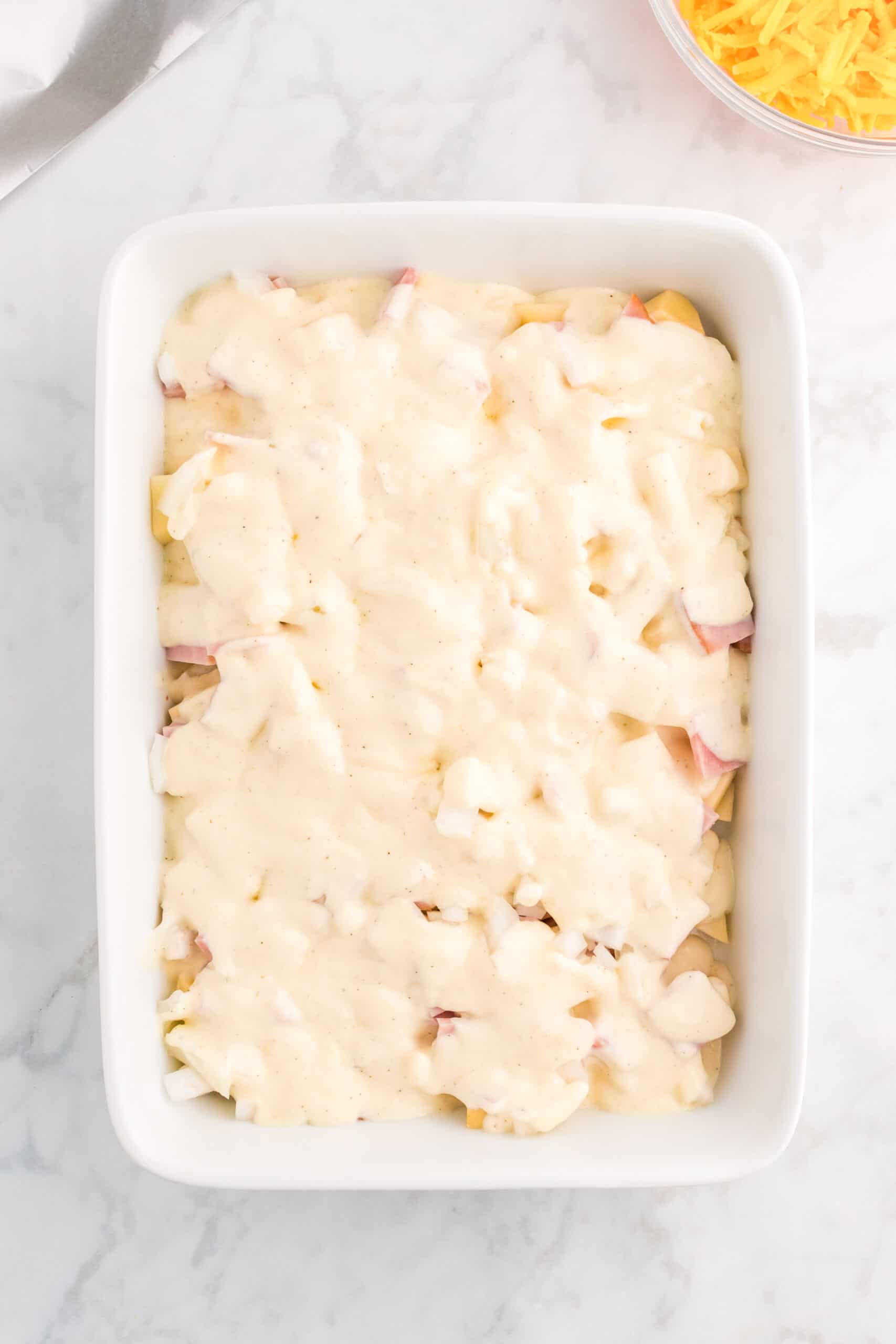 - Pour the soup mixture over the potatoes, ham, and onions, making sure to cover everything.