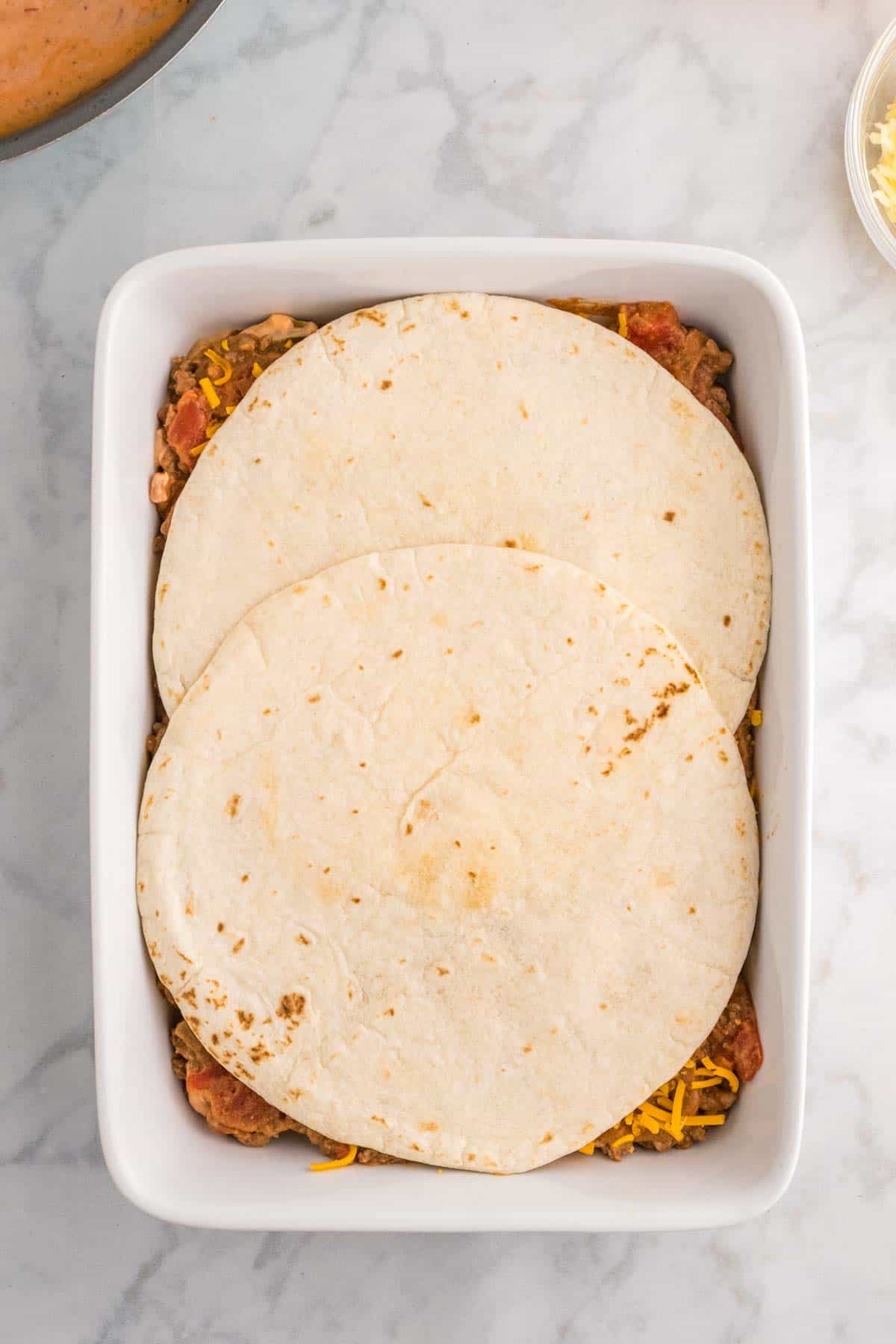 - To assemble the casserole, start by placing two tortillas on the bottom of the greased baking dish (they will overlap in the middle).