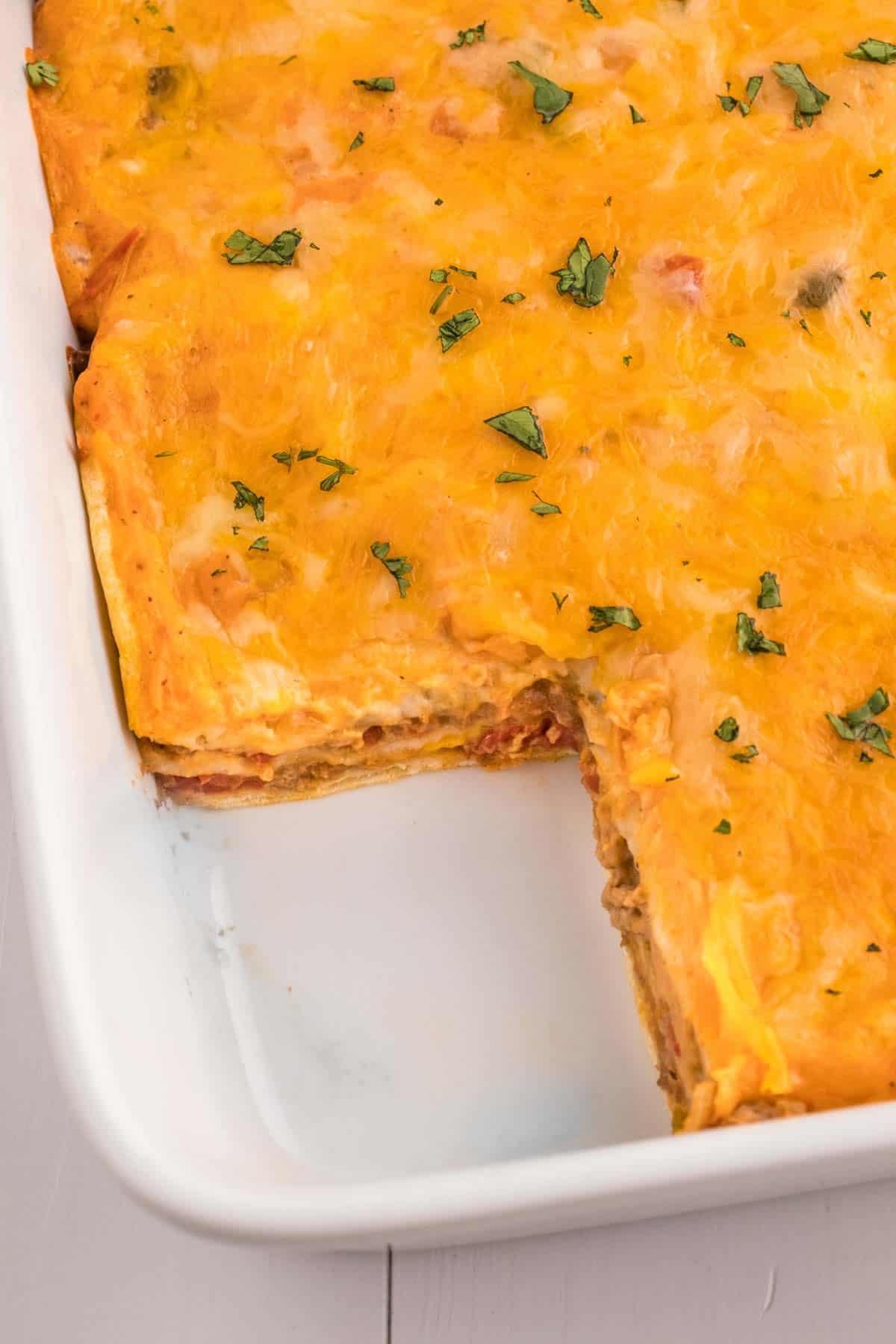 - The corners of the casserole will not have tortillas, so you can break up extra tortillas to fill in those empty spaces if desired.