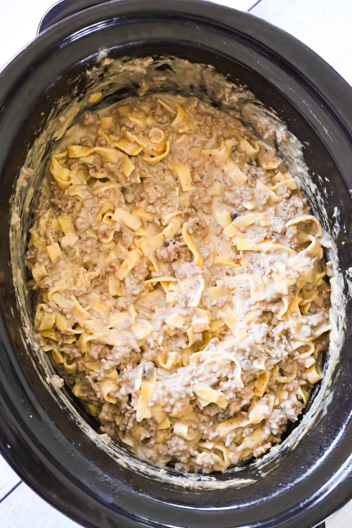 Crock Pot Beef and Noodles is an easy slow cooker dinner recipe loaded with ground beef and egg noodles cooked in a sauce made from beef broth and cream of mushroom soup.