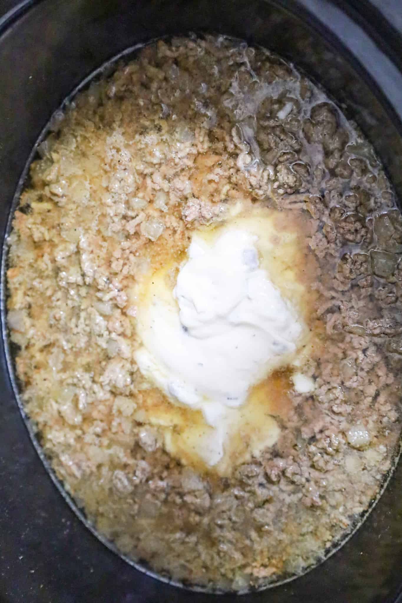 This slow cooker dish loaded with hamburger meat is a kid friendly dinner.