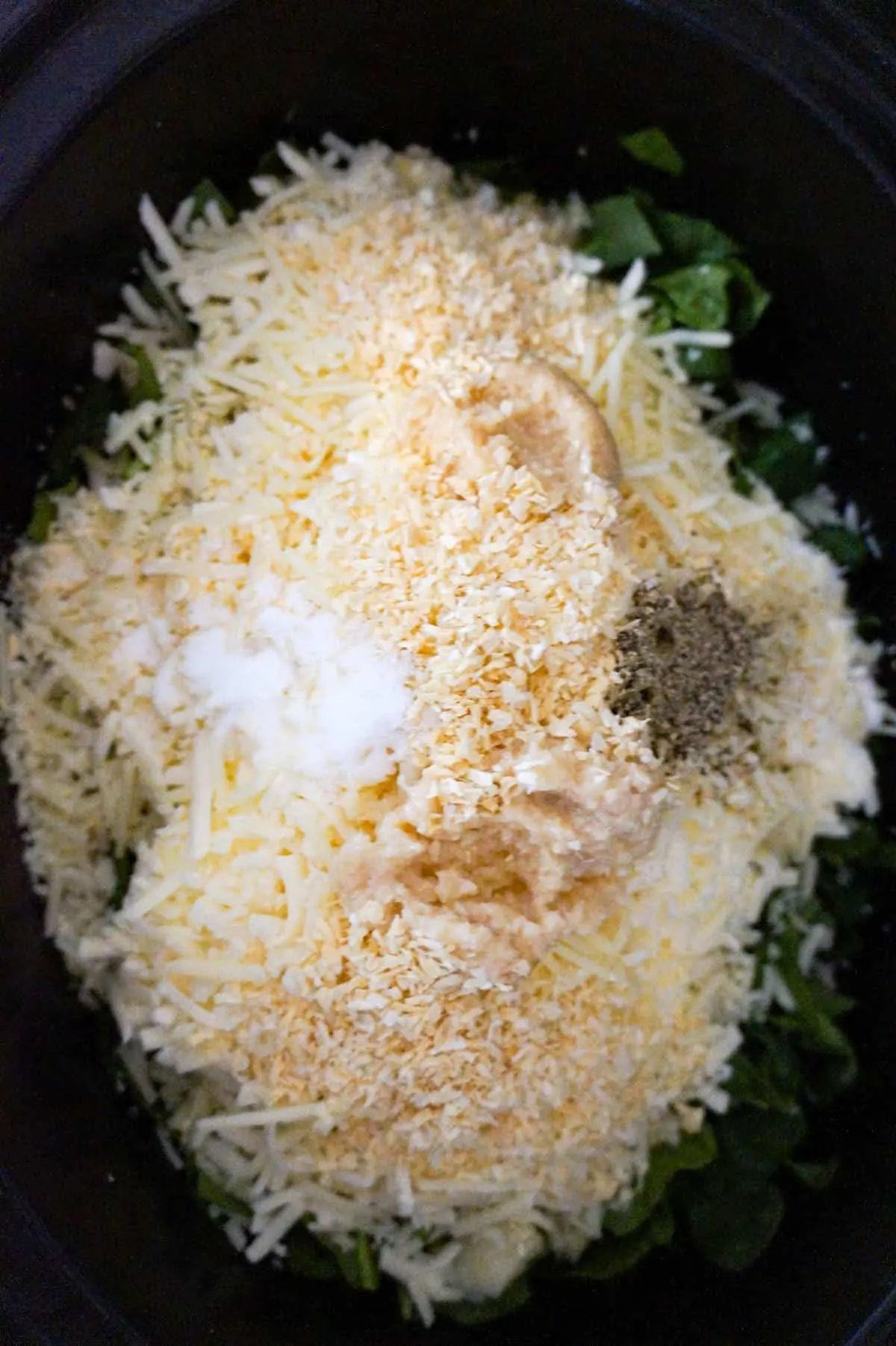 - Add the cream cheese, sour cream, mozzarella cheese and parmesan cheese to the Crock Pot.