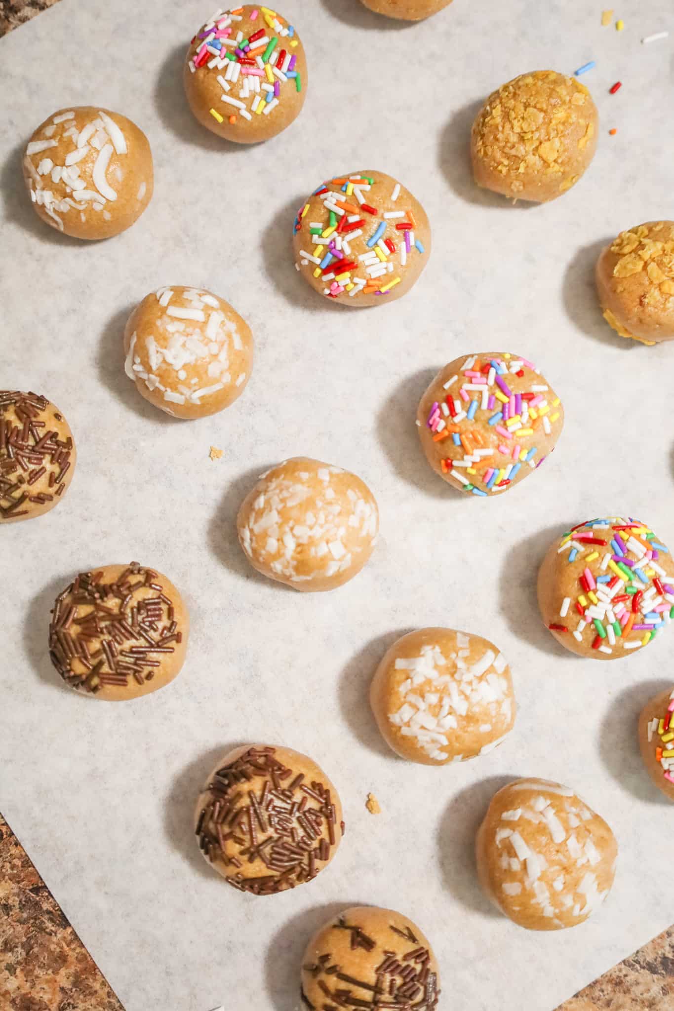 I rolled my peanut butter balls in sprinkles, shredded coconut and crumbled corn flakes to have a variety of options.