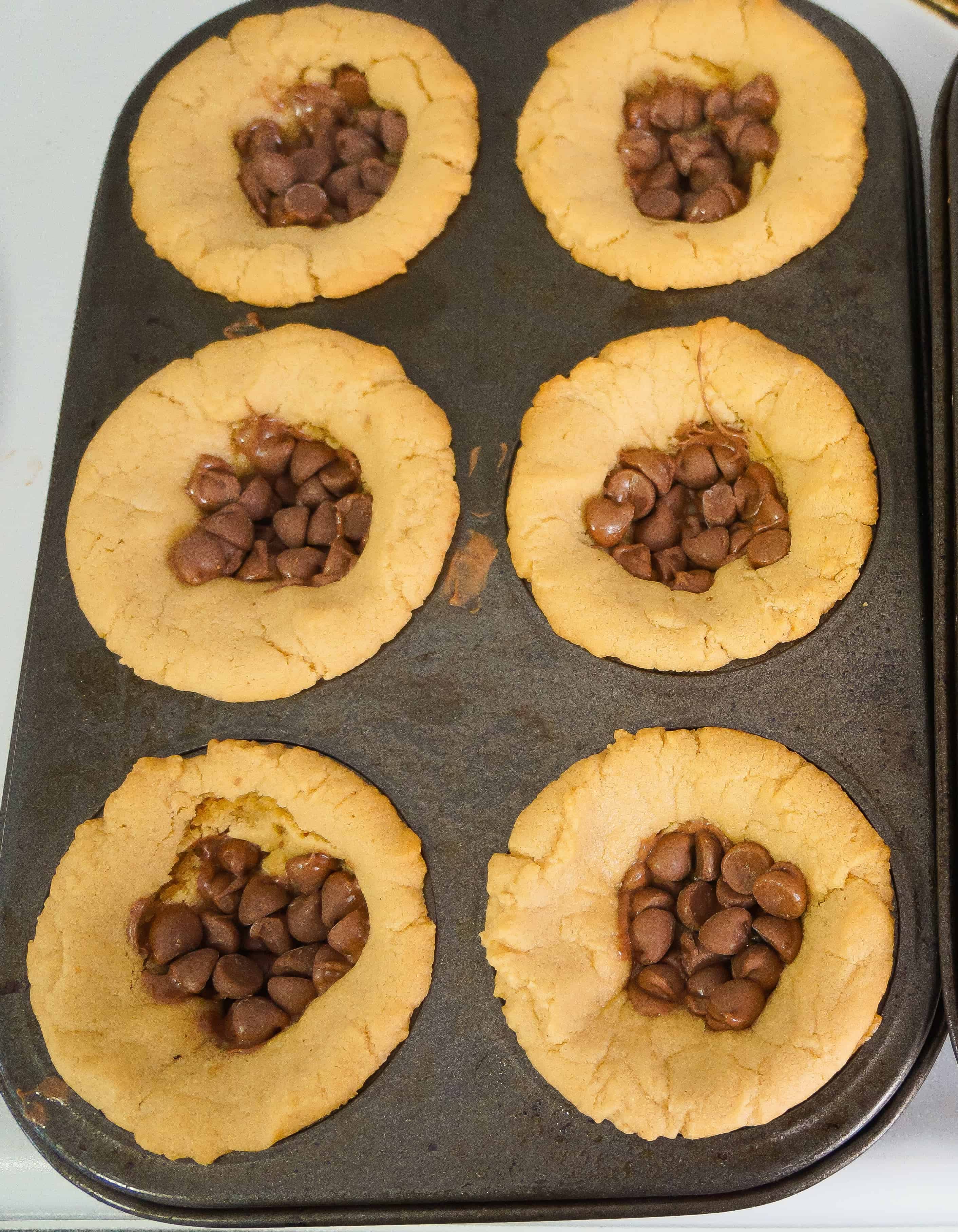 - Divide 1 cup of chocolate chips evenly amongst the cups. Push them down gently into the cookie.