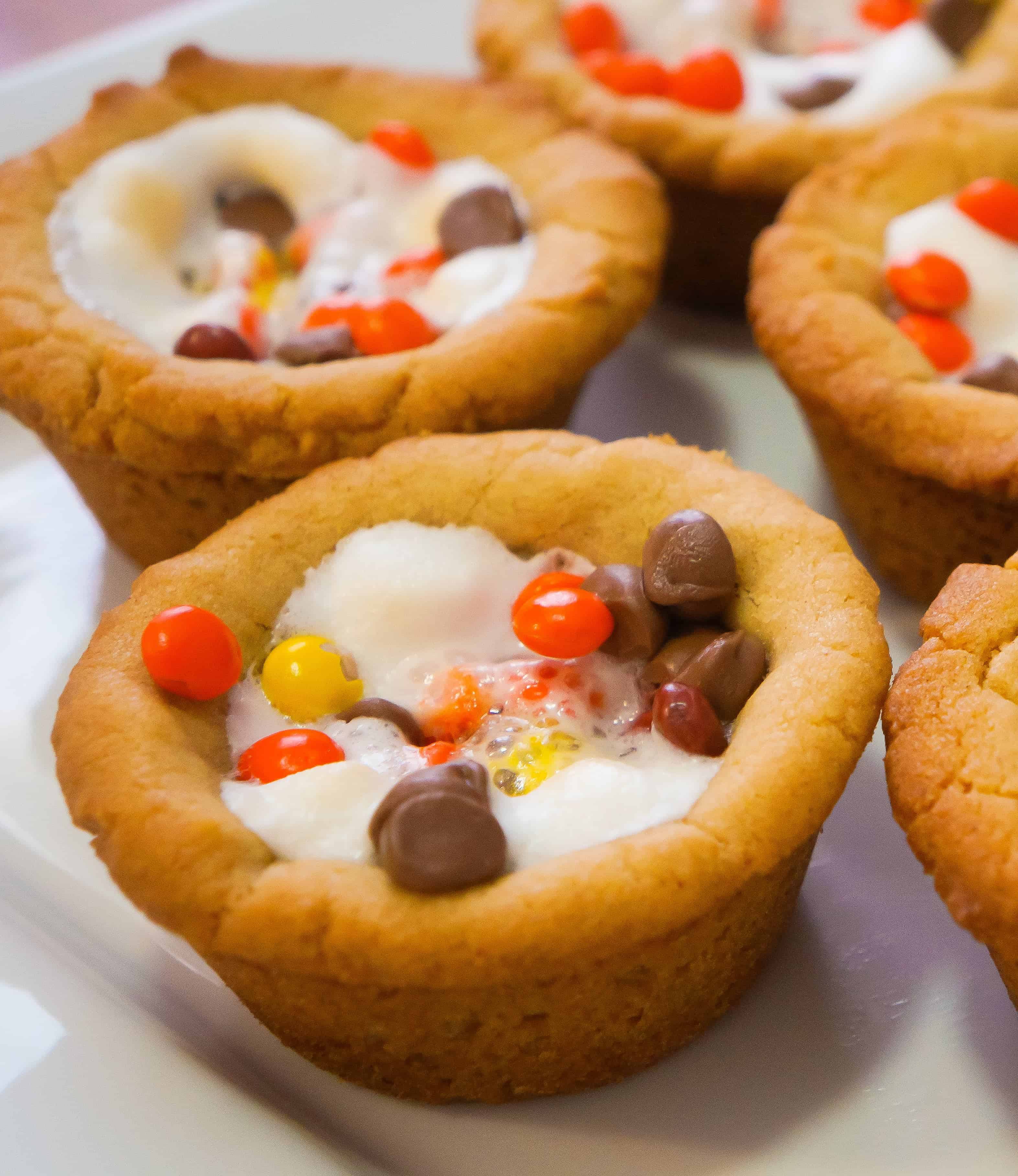 Peanut Butter Cookie S'Mores Cups are an easy dessert recipe using muffin tins. These peanut butter cookie cups are filled with mini marshmallows, chocolate chips and Reese's Pieces candies.