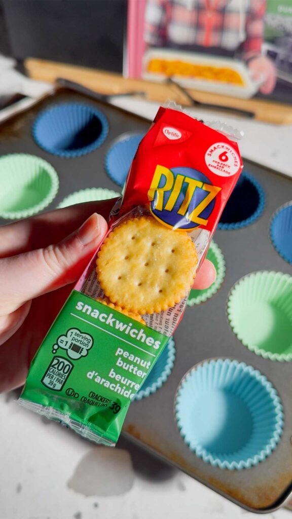 I started by placing Peanut Butter Ritz Cracker Snackwiches into the bottom of my silicone muffin cups.