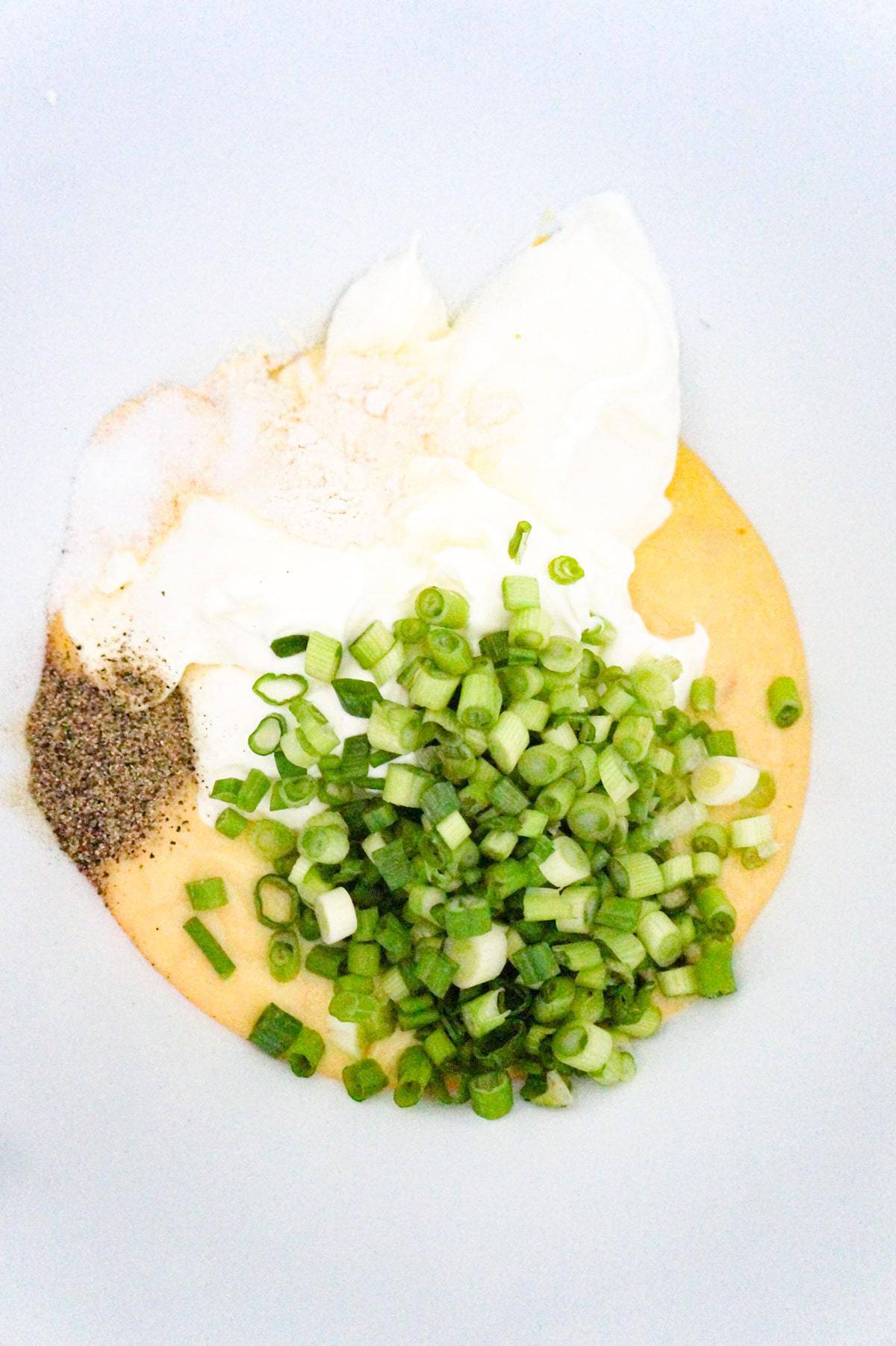 - Dump the cream of chicken soup, sour cream, chopped green onions, salt, pepper, onion powder and garlic powder into a large mixing bowl.