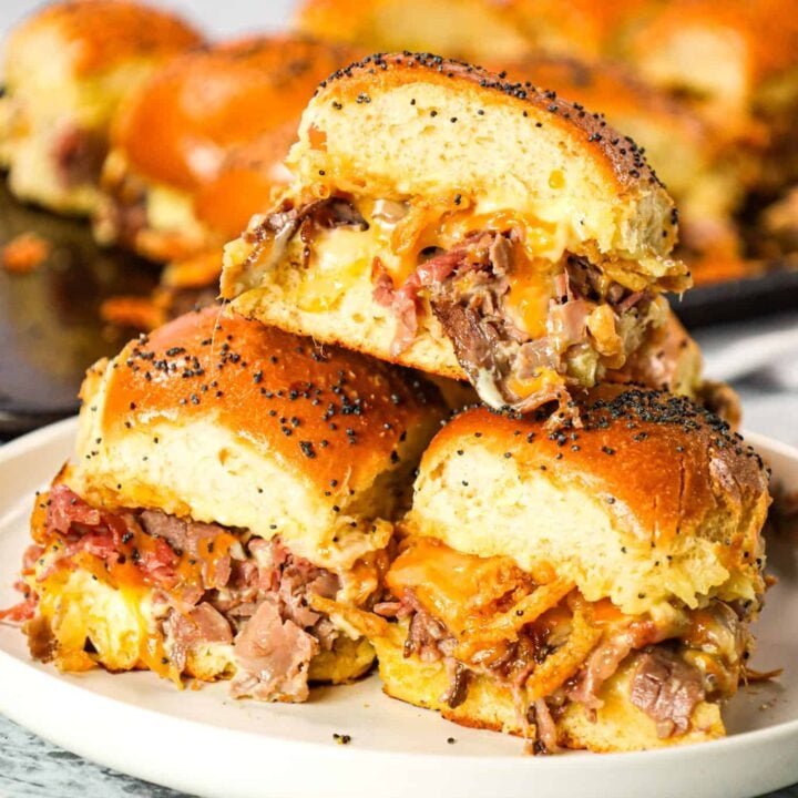 Roast Beef Sliders are an easy dinner or party snack made with dinner rolls and loaded with deli shaved roast beef, mayo, horseradish, mozzarella, cheddar and crispy fried onions.