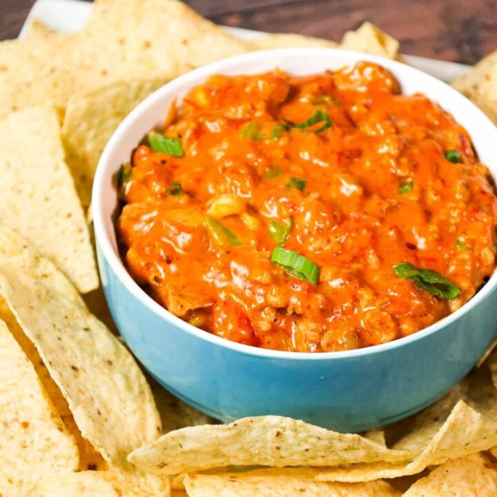 Rotel Dip is a cheesy dip made with Velveeta and loaded with ground sausage, Rotel diced tomatoes and green chilies, taco seasoning and chopped green onions.