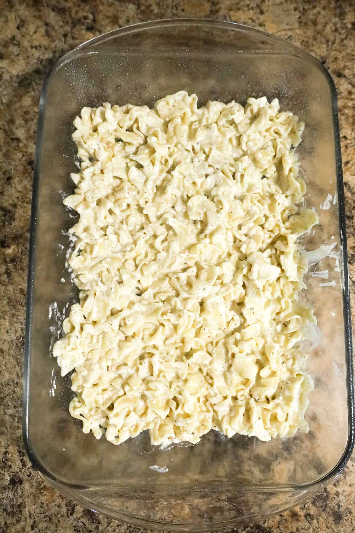 - Spoon half of the noodle mixture into the baking dish and spread it out evenly.