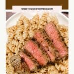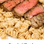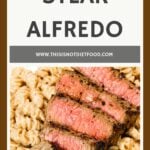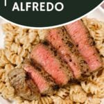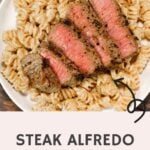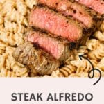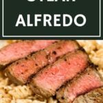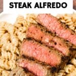 Steak Alfredo is an easy dinner recipe with creamy garlic parmesan pasta topped with tender slices of eye of round steak.